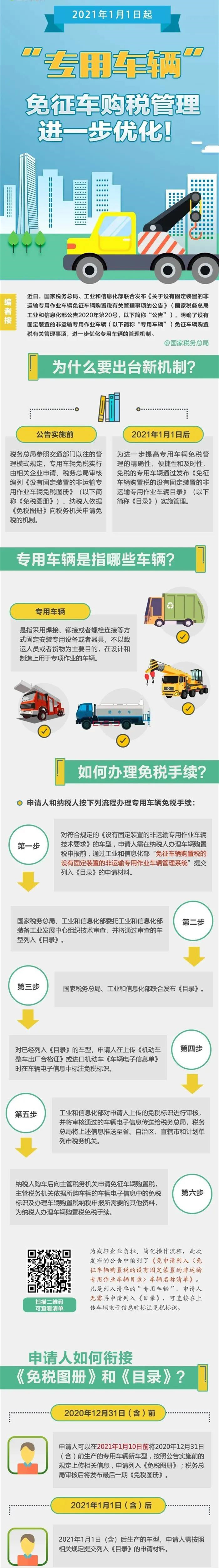 2021年1月1日起,我國將對免征車輛購置稅的設(shè)有固定裝置的非運(yùn)輸專用作業(yè)車輛(以下簡稱“專用車輛”),由原來的“《免稅圖冊》管理”改為“《目錄》管理”。為確保該項機(jī)制順利實施,稅務(wù)總局、工信部日前聯(lián)合發(fā)布《關(guān)于設(shè)有固定裝置的非運(yùn)輸專用作業(yè)車輛免征車輛購置稅有關(guān)管理事項的公告》(國家稅務(wù)總局 工業(yè)和信息化部公告2020年第20號),明確若干管理事項。消防車屬于專用車的一種,也屬于免征車輛,以下要點(diǎn)需要納稅人關(guān)注↓