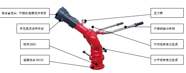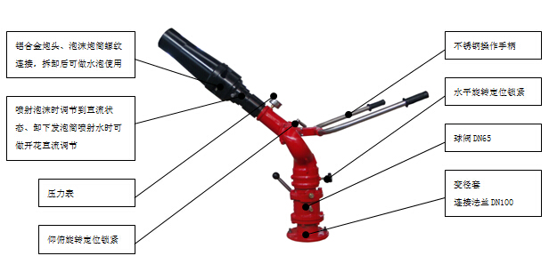結(jié)構(gòu)特點(diǎn):泡沫炮主要由手把、底座、進(jìn)水管、回轉(zhuǎn)體、鎖緊裝置、泡沫噴射系統(tǒng)及轉(zhuǎn)動(dòng)機(jī)構(gòu)組成,在8-10MPa的壓力范圍內(nèi)具有良好的性能,它不但能噴射泡沫,又能噴射水。噴射空氣泡沫時(shí),將比例混合器調(diào)整至與本炮的流量值后即可使用。