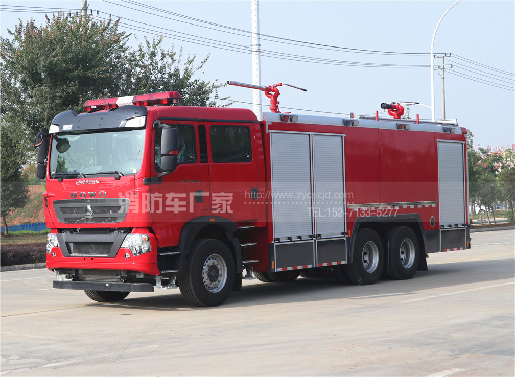 豪沃雙橋泡沫干粉聯用消防車采用中國重汽集團濟南卡車股份有限公司生產的豪沃型載重汽車二類底盤,駕駛室可翻轉,便于發動機維修。上裝包括泵房、器材箱、水罐、泡沫罐和干粉罐等,整車載液量為水6000L、泡沫2000L,干粉3000L。水罐采用優質Q235碳鋼板、泡沫罐采用304不銹鋼焊接而成,干粉罐體材質為Q345R。裝備CB10/60常壓消防泵、PL8/48型兩用消防炮、PF5~15/30干粉炮。該車具有功率大、車速高、操作方便等特點;可廣泛用于大中城市公安消防隊、石油化工、廠礦企業、港口和碼頭等場所,可撲救大型油類火災和一般物質火災,是理想的中型消防設備。